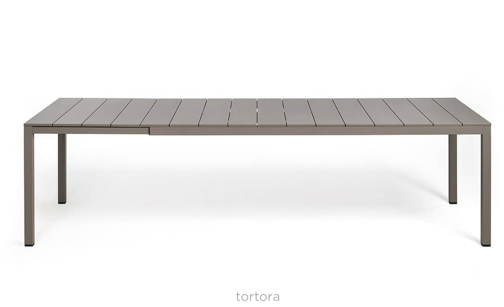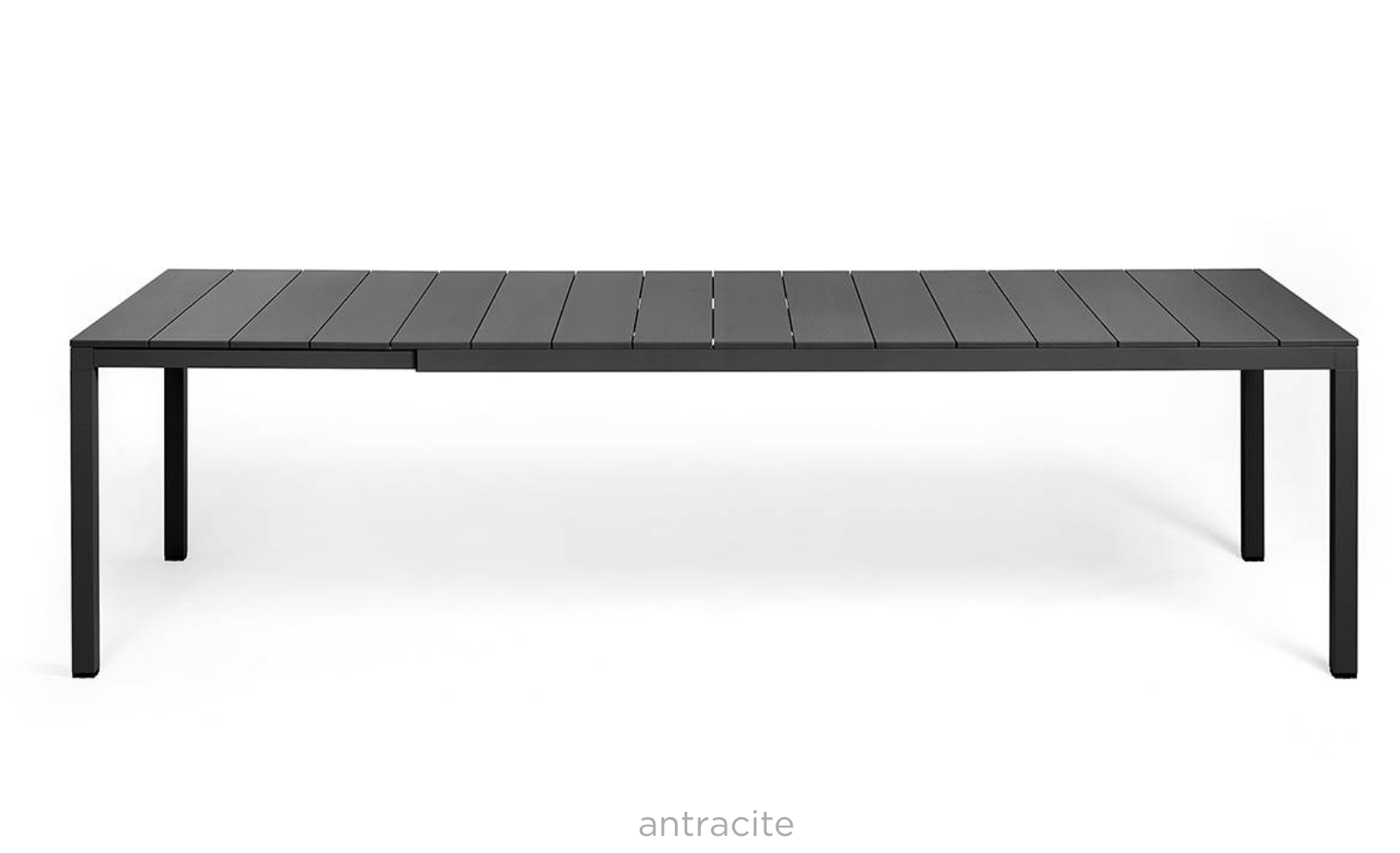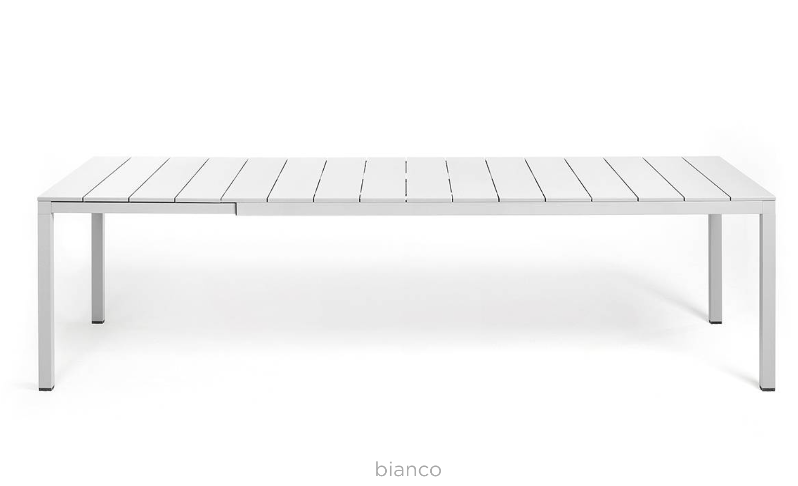 Udtrækkeligt bord med arkitektoniske detaljer og en karakteristisk personlighed. Lameller, let ribbet malet aluminiumsplade og malet aluminiumsstel. Fås i to størrelser for at imødekomme forskellige pladsbehov.