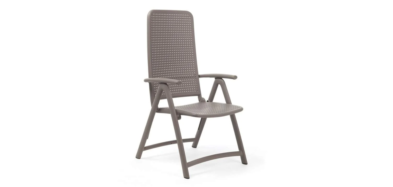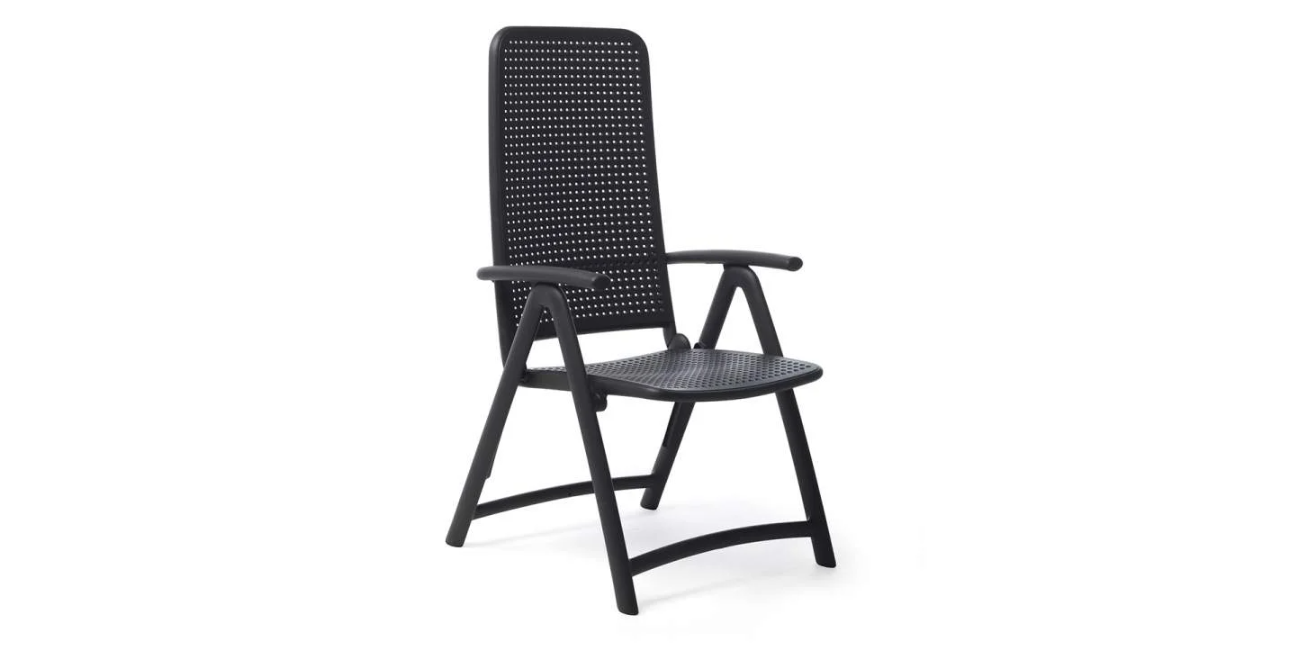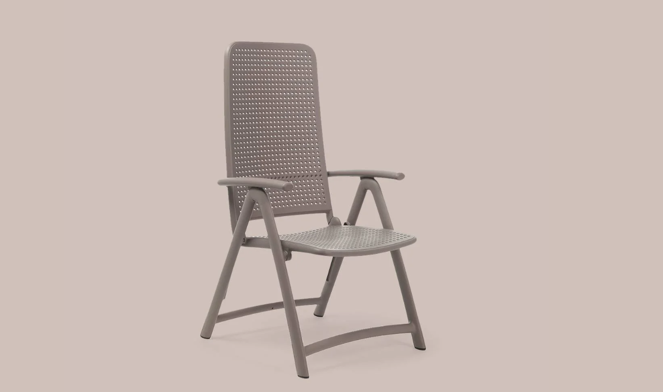 Darsena er en afslappende, foldbar udendørs lænestol, der er lavet af UV-behandlet, massefarvet glasfiberharpiks. Den har et højt ryglæn med fire justerbare positioner og har et perforeret polkaprikket mønster og en mat finish.