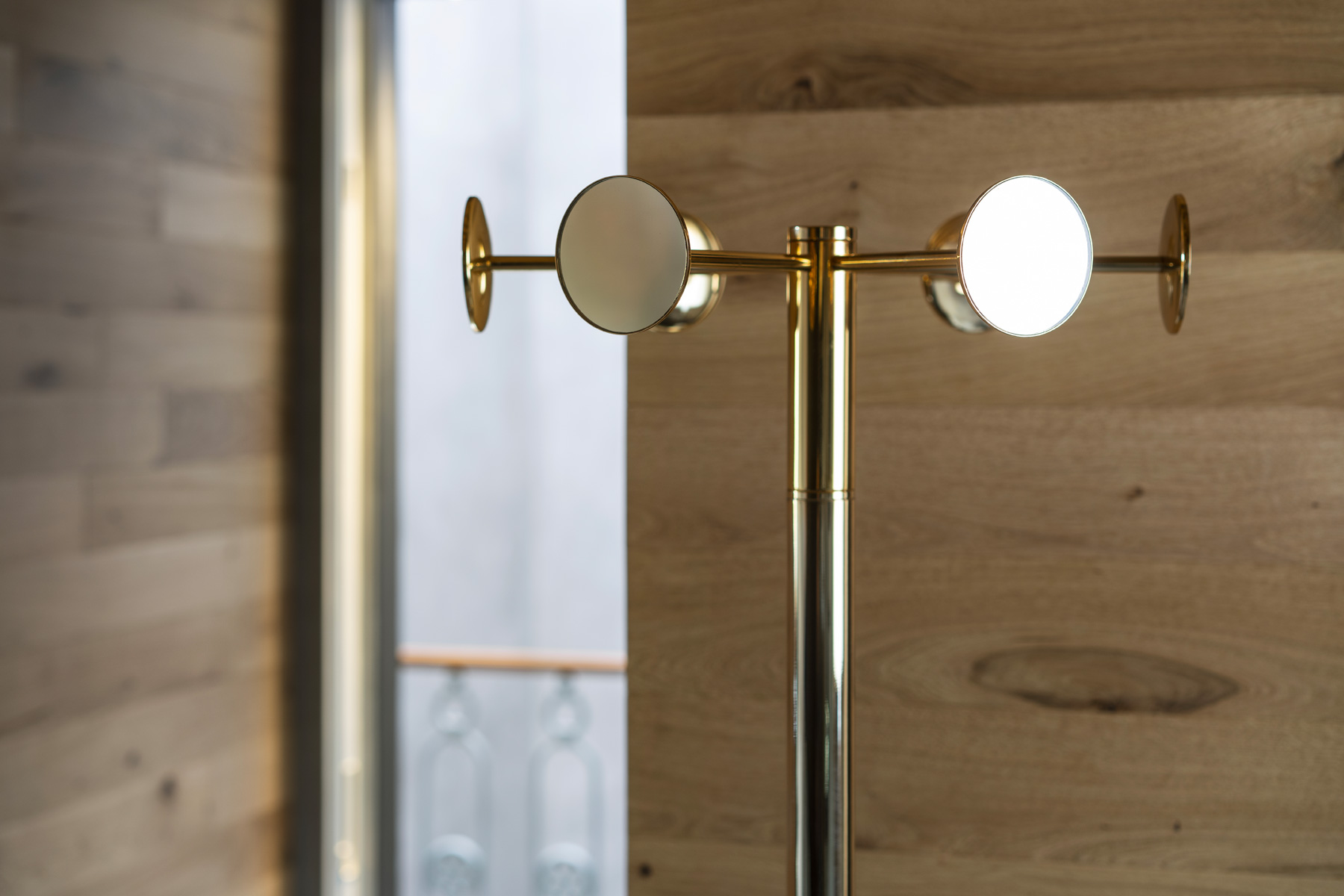 Chaperon er en bøjle designet af Bruno Rainaldi for Opinion Ciatti. Fritstående bøjle med roterende krone, enkelt (6 spejle) H168 eller med fire elementer (18 spejle) H178. Fås i følgende finish: krom med sølvspejling, guld med guldspejling.