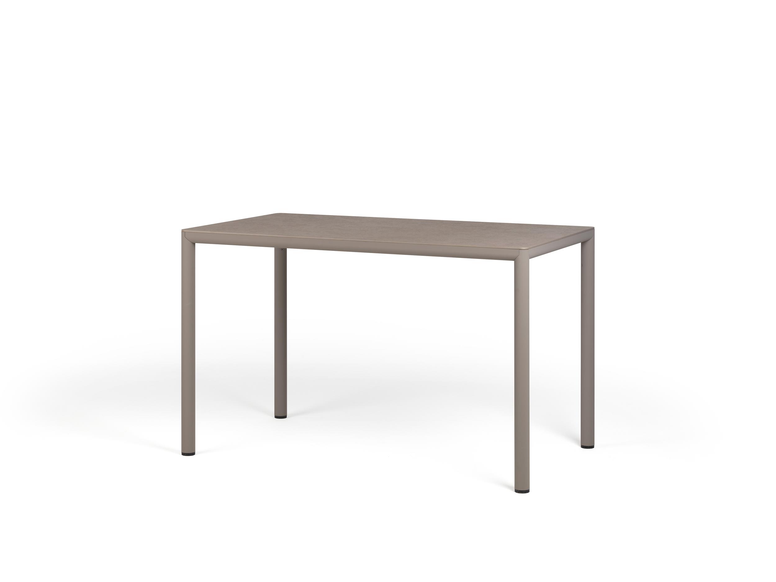 Dens design har en ultratynd rektangulær top i tekstureret laminat , hvis hjørner er fint afrundede for at give den en blød og elegant linje.