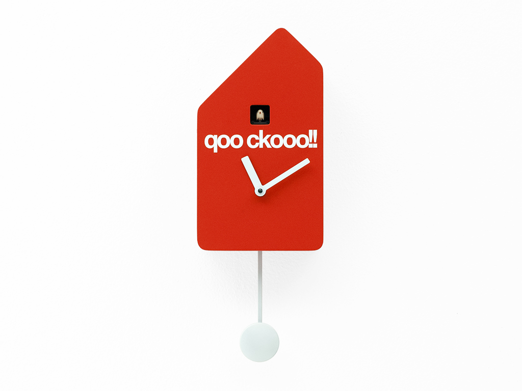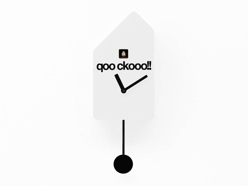 Det klassiske gøgehus er blevet genoptaget på en moderne måde med dristige linjer og rene linjer, der eliminerer enhver overflødighed, hvilket skaber et designer-gøgur med et karakteristisk asymmetrisk tag. Den eneste dekoration er mellem fuglen og viserne, og er ordet "qoo ckooo!!", der lyder som fuglens sang. Batteridrevet quartz-urværk. En lysfølsom sensor stopper automatisk ringningen i fravær af lys.