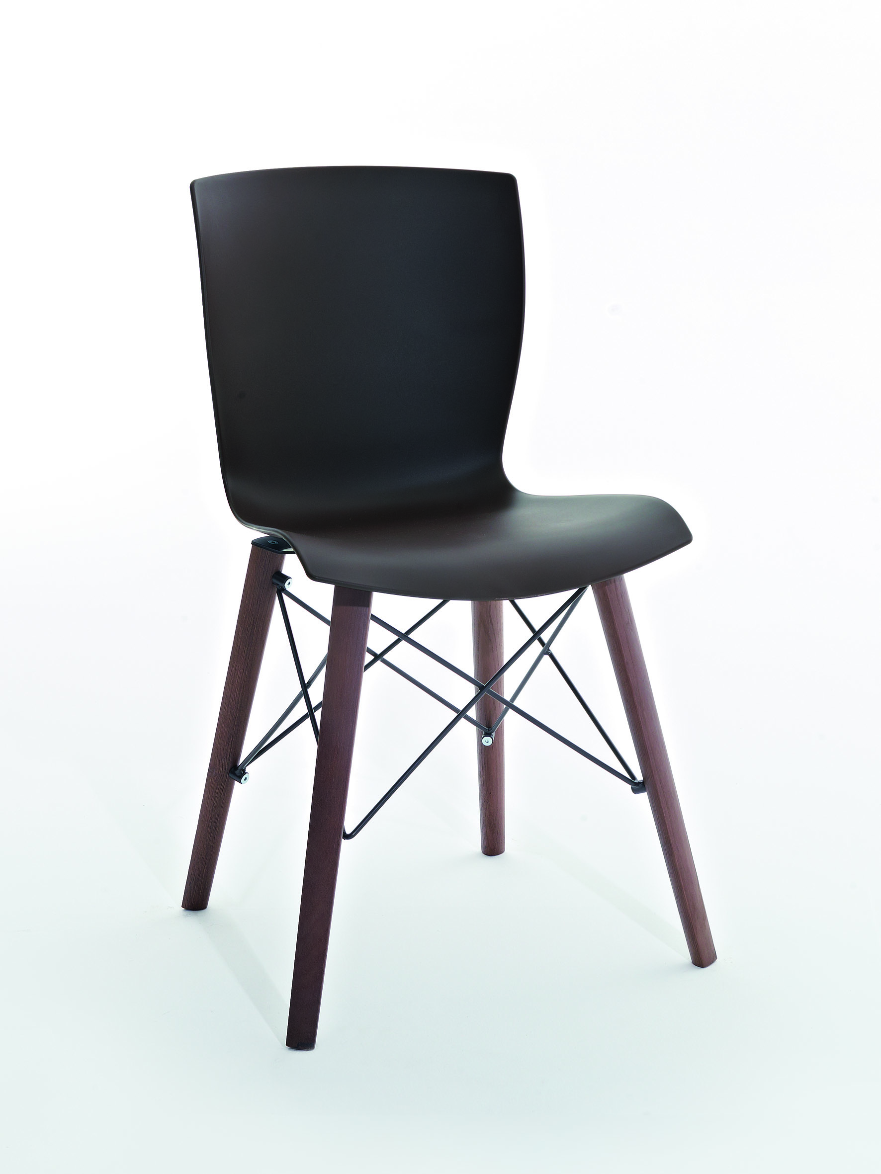 Stol med stel af egetræ og stål og et blødt sæde af polypropylen.