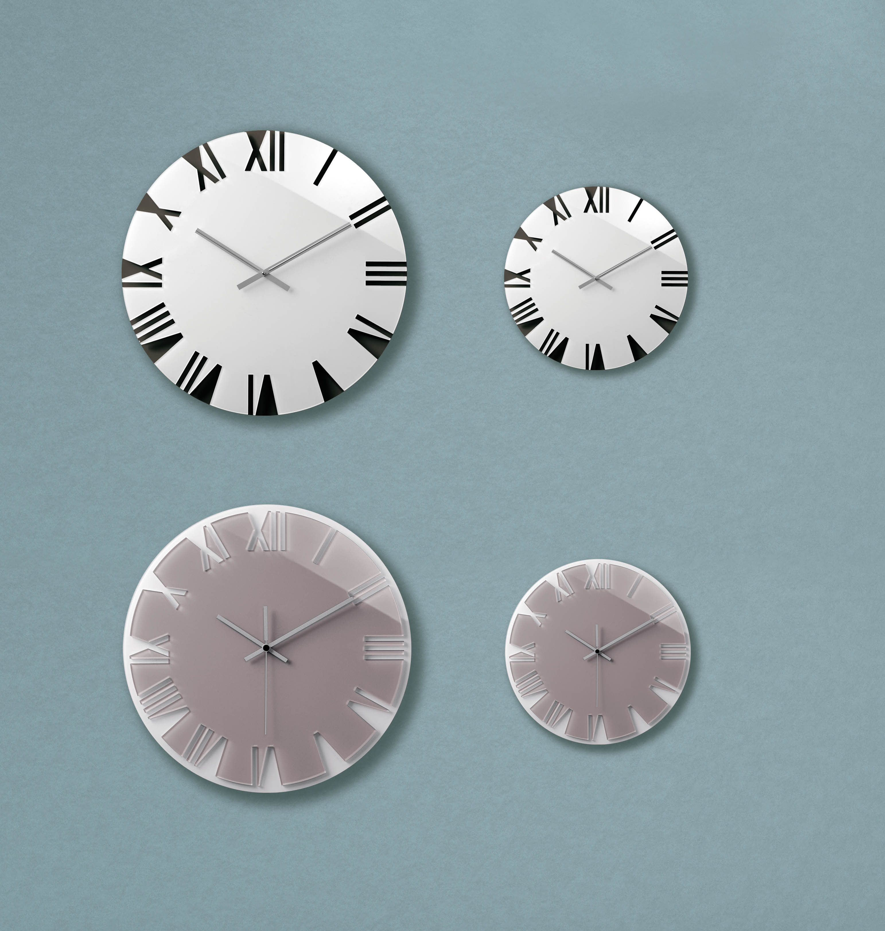 Rundt vægur i tofarvet akrylkrystal og kvartsurværk.
