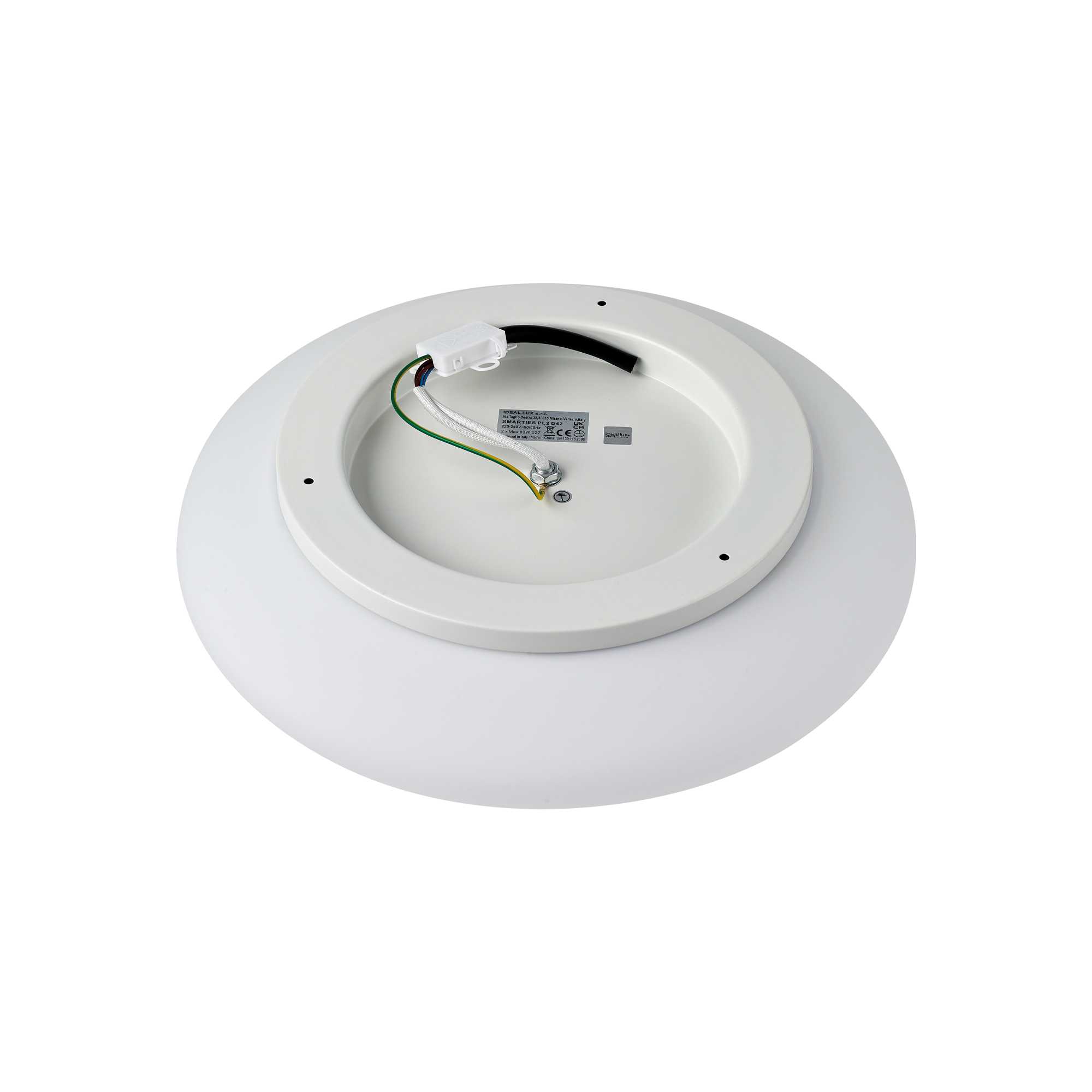 Den mathvide metalbase huser en hvidmundet glasdiffusor , der er fremstillet til at give et blødt, omsluttende lys. Loftlampen har plads til to E27-pærer, hvilket sikrer nem vedligeholdelse og frihed til at vælge lysintensiteten.