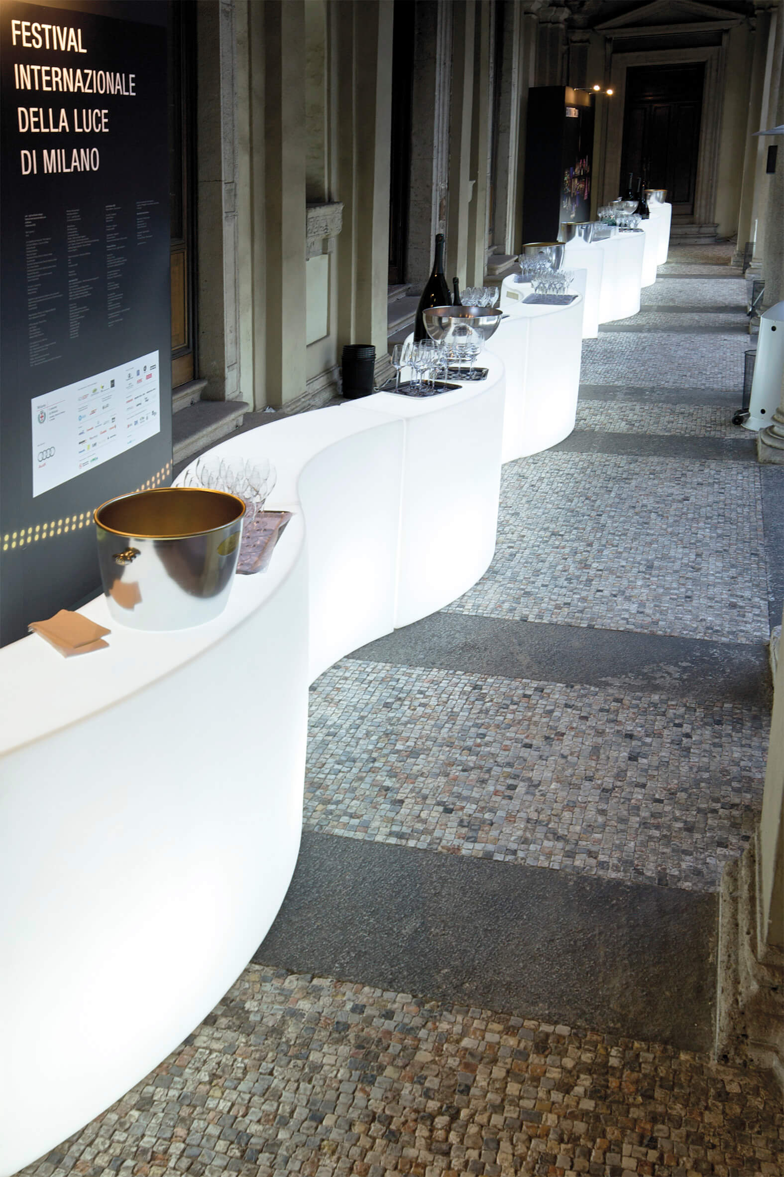 Snack Bar er en modulær, oplyst bardisk, der perfekt kombinerer form og funktion. Dens enkelhed og bordpladens højde gør den perfekt til catering. Ligesom alle de oplyste bardisker, der har gjort SLIDE berømt verden over, kan Snack Bar kombineres i flere moduler for at skabe lange bordplader i store rum. Snack Bar er ideel til både indendørs og udendørs brug i moderne og trendy omgivelser. Den er lavet af polyethylen og kan tilpasses med logoer og billeder, hvilket gør den ideel til kontraktprojekter og events, der ønsker at gøre et statement.