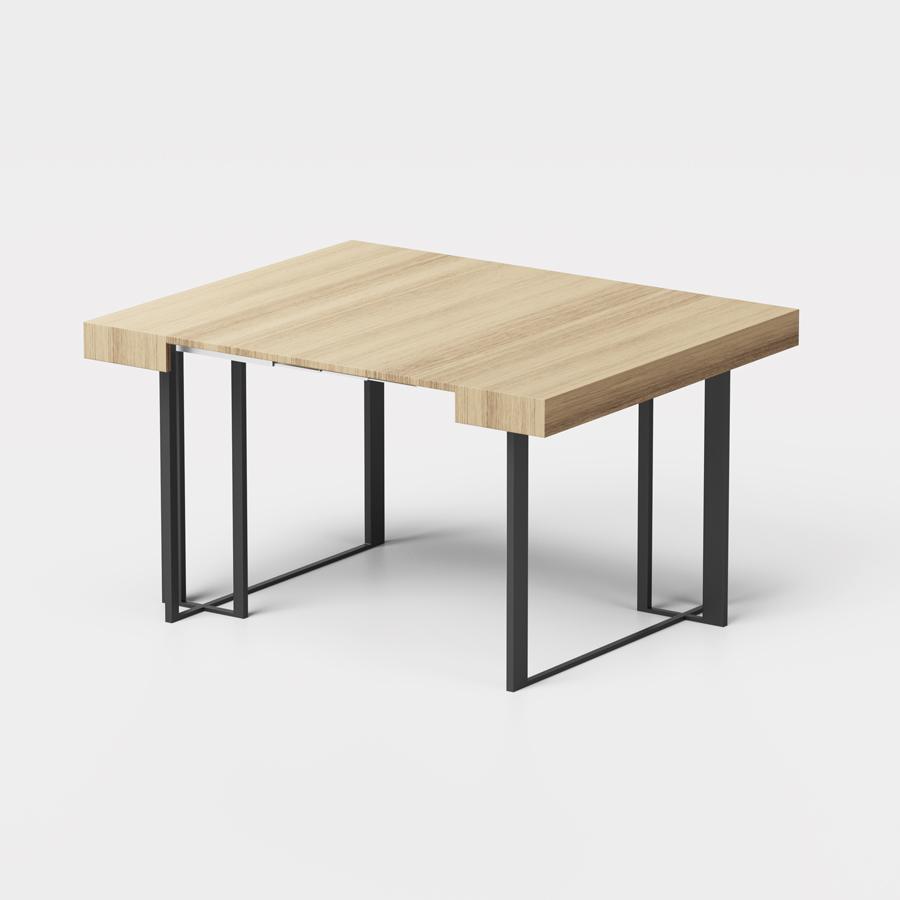 Udtrækkeligt konsolbord med malet stålkonstruktion og miljøvenlig laminatplade med sammenklappelig funktion.