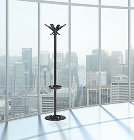 Gulvgarderobe bestående af en base af dybtrukket stål med afrundede kanter for at forhindre skader på gulvoverfladen, pulverlakeret