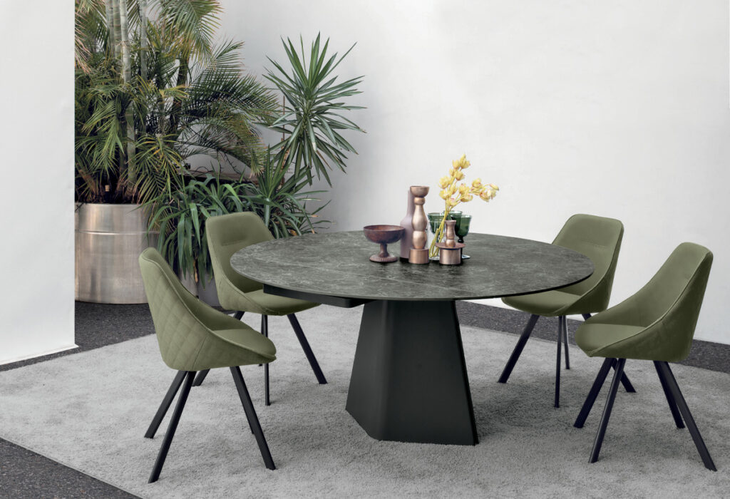 Bord med tøndeformet bordplade, der kan laves om til et rundt bord med plads til 6-8 personer. Central base i malet metal og en halvautomatisk roterende bordplade i porcelæn og stentøj.