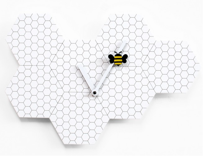 Et sjovt og farverigt vægur, ideelt til børneværelser eller til at tilføje et strejf af munterhed og lethed til ethvert rum. Time2bee er fremstillet af stål og fremkalder formen og grafikken af bistader, med en gul og sort bi, der hænger fra minutviseren og bevæger sig fredeligt mellem cellerne. Batteridrevet quartz-urværk.