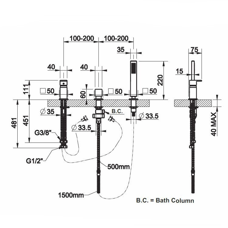 Tre-huls blandingsbatteri til badekar til vandtilførsel til badekarssøjle med omskifter.