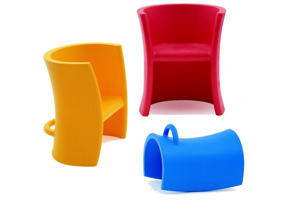 Polyethylen børnestol med tre funktioner: høj, lav og gyngehest. Også egnet til udendørs brug.