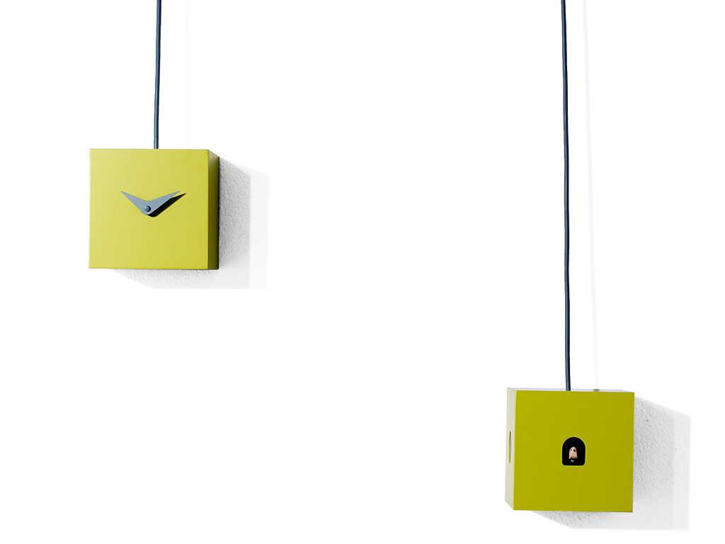 Gøgur lavet af rødt, sort, hvidt eller grønt malet træ. Det kan hænges på væggen eller i loftet. Batteridrevet kvartsurværk. En lysfølsom sensor stopper automatisk lyden i fravær af lys.
