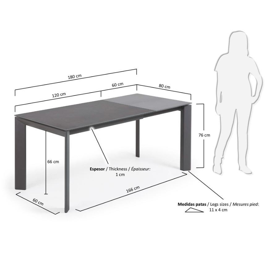 Udtrækkeligt bord med epoxybelagt stålstel og porcelænsplade med glasunderlag. Roca Volcano-finish. Maksimal længde 180 cm.