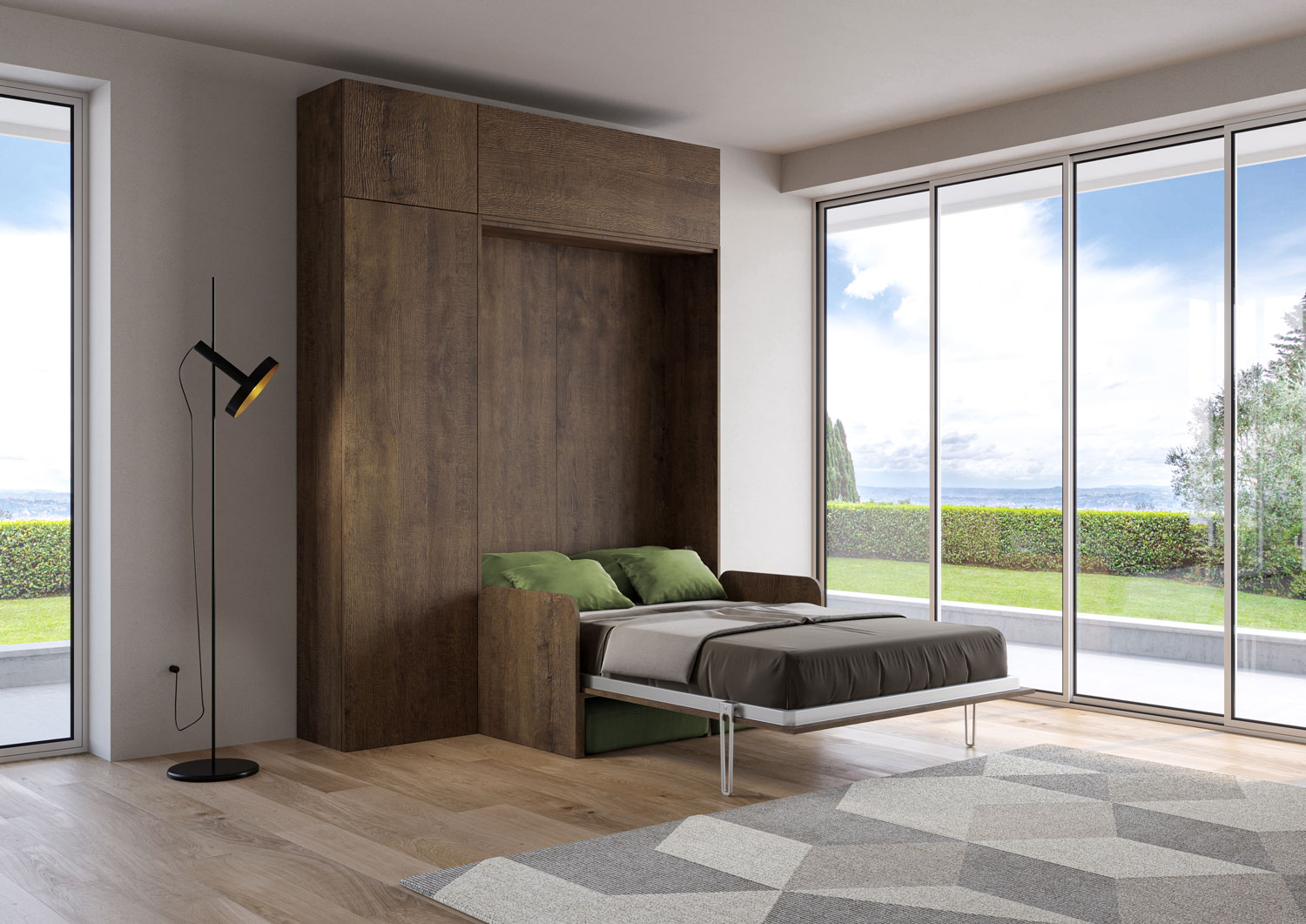 Letto una piazza e mezzo a scomparsa 120 Kentaro con divano e mobili bianco frassino, verde