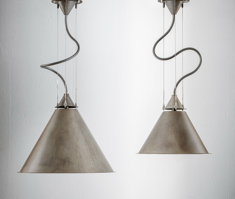 Ogni sospensione è dotata di cavi laterali in acciaio inox per la regolazione dell’altezza in fase di installazione, e di un tubo centrale flessibile in metallo che ne completa la struttura.