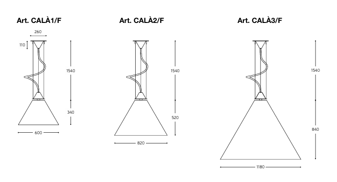 La linea Calà è proposta in tre diverse dimensioni, pensate per l’illuminazione di grandi spazi, sia privati come cucine e salotti, sia pubblici come ristoranti o bar.
