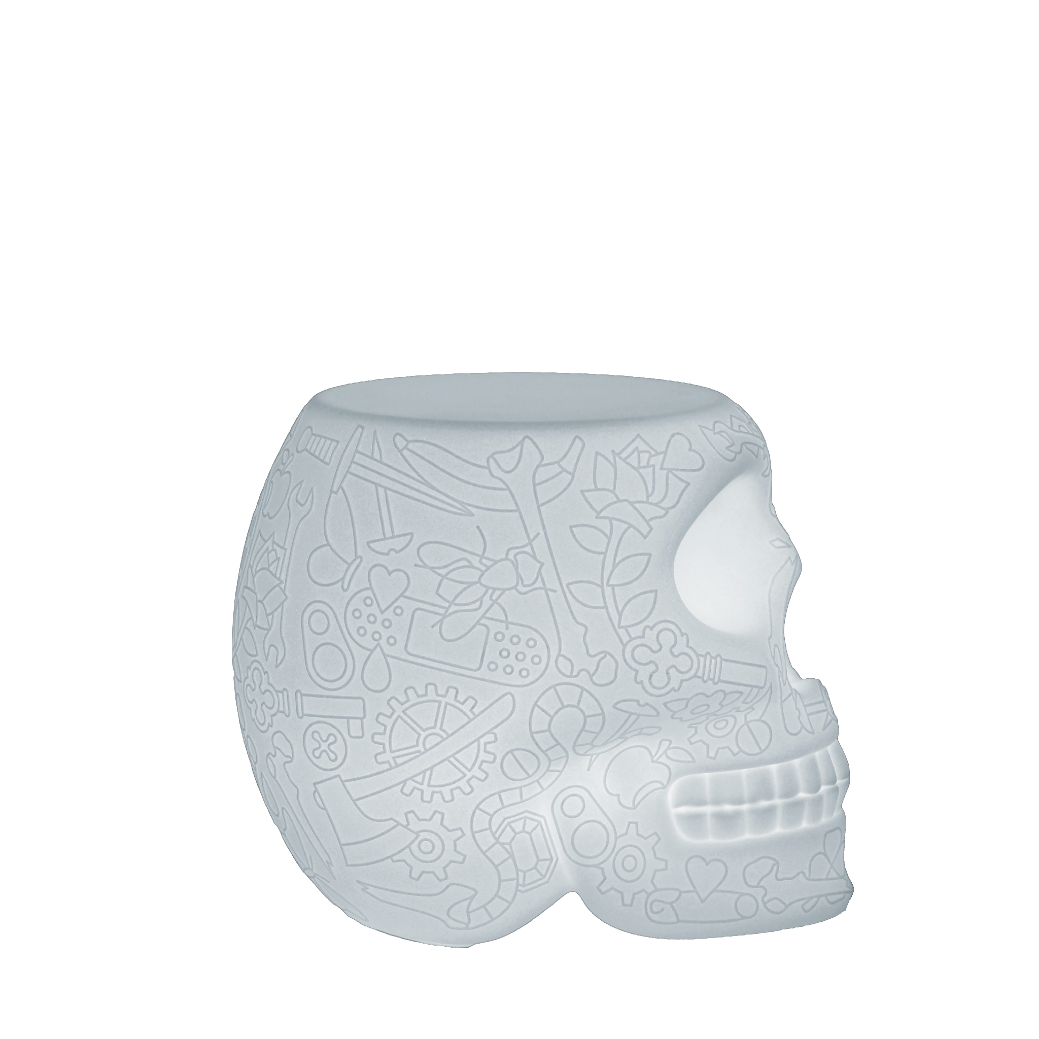 Mexico, disegnata da Studio Job, è una lampada a forma di teschio con un motivo grafico sulla superficie, che funziona sia come sgabello che come tavolino. Ricordando i tradizionali teschi dipinti dell'omonimo paese, il Messico è un estroso richiamo alla ciclicità della nostra presenza sulla Terra, per esorcizzare la morte e celebrare la vita. Adatto per aree lounge, sale da pranzo e spazi esterni. Wireless, con batteria ricaricabile, luce LED e 16 diversi colori RGB intercambiabili, può essere regolato a distanza tramite telecomando.