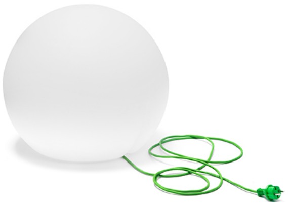 Una sfera che non è una sfera: appoggiata sembra che stia spuntando dal terreno, appesa al ramo di un albero ricorda un frutto maturo. Lampada da terra e lampada a sospensione adatta per uso outdoor. La pratica maniglia posizionata sulla base la rendono facile da prendere, spostare e appendere.