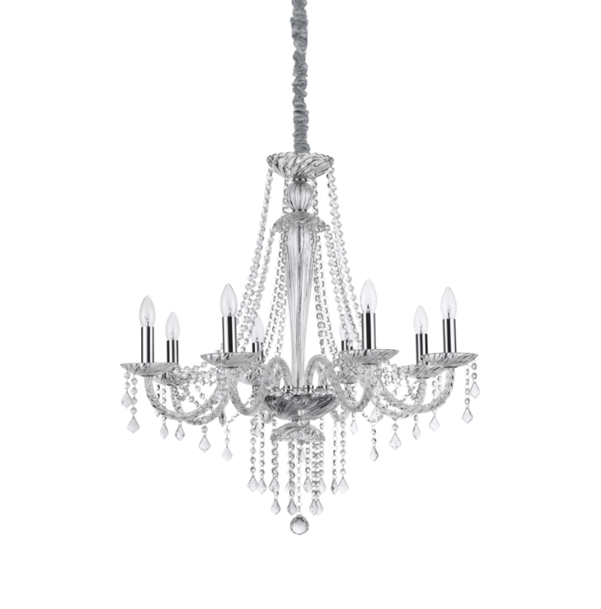 Montatura in metallo cromato. Elementi decorativi in vetro soffiato e cristallo molato. Copricatena in velluto.