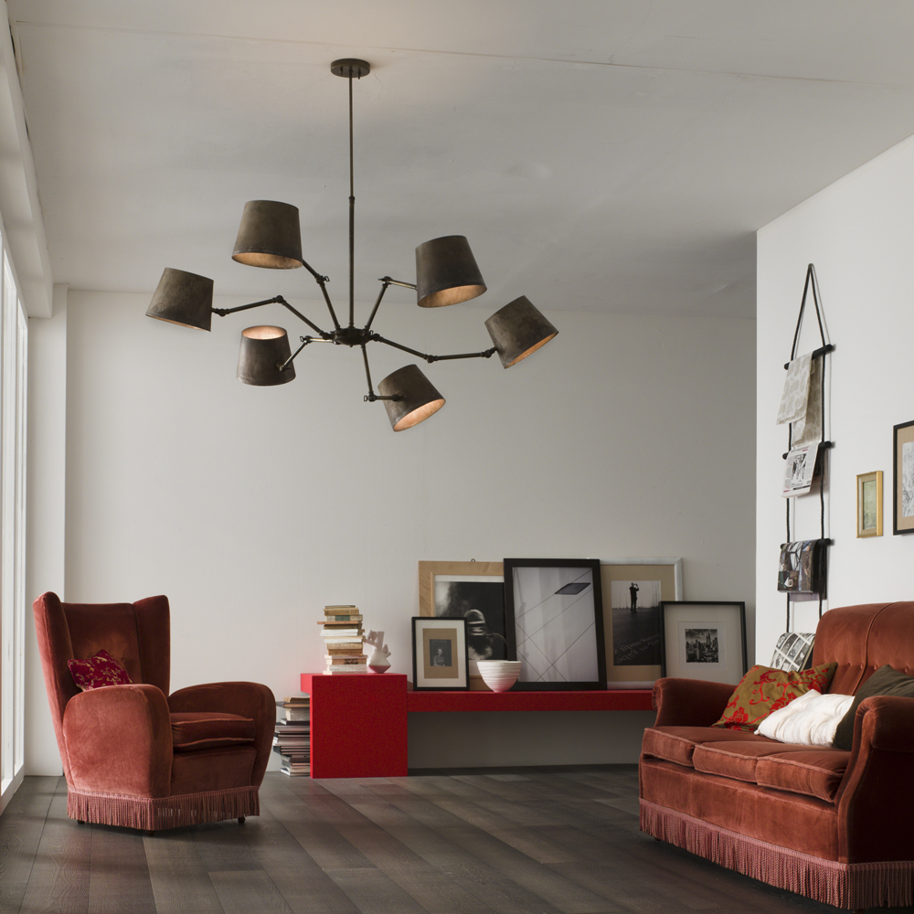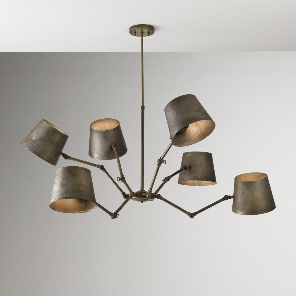 Elementi classici e riferimenti industriali si incontrano in una collezione composta da sospensioni, applique, una lampada da tavolo ed una piantana , disponibili nella finitura ferro con snodi in fusione di ottone.