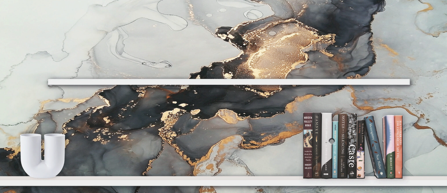 Lo sfondo decorativo, il celebre Black and Gold di Pintdecor, presenta un elegante motivo astratto in nero e oro che crea un contrasto scenografico con le mensole chiare.