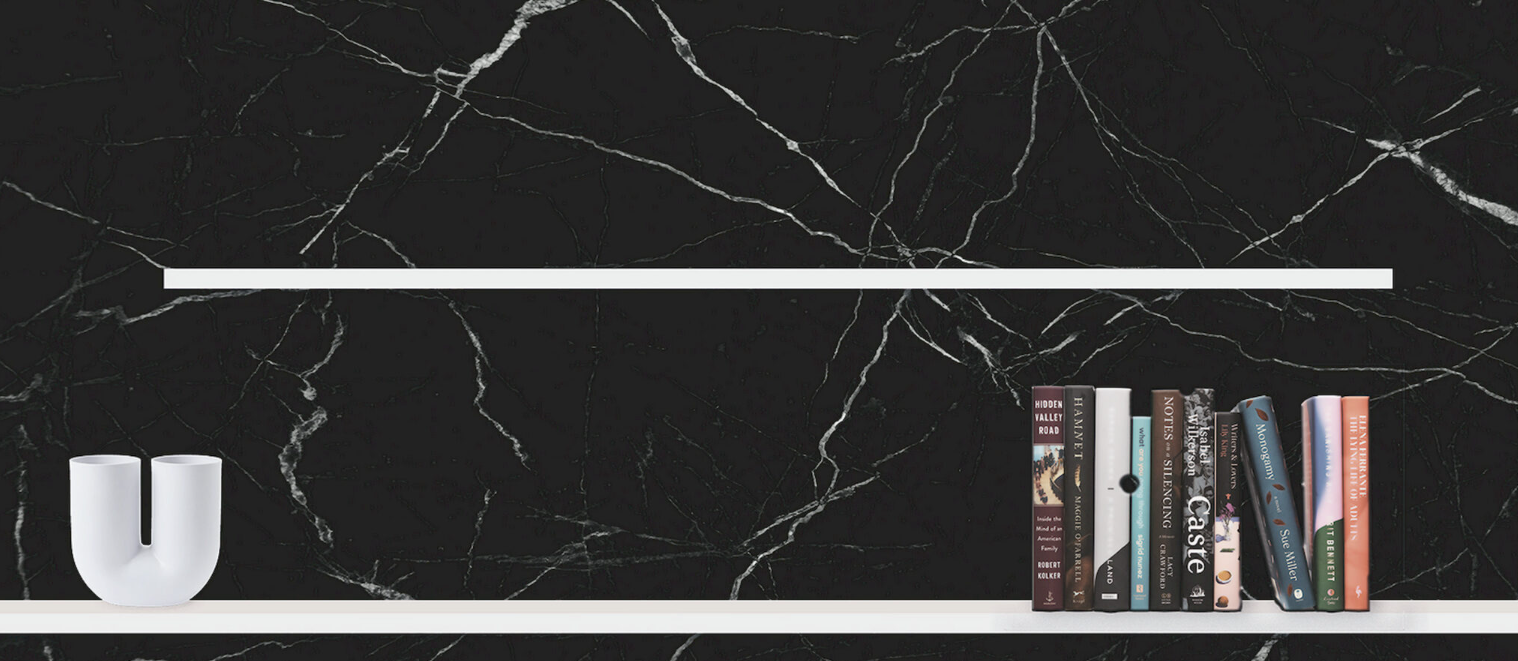 Caratterizzata da un pannello di fondo con effetto marmo nero, questa libreria presenta due mensole sfalsate laccate in bianco avorio, creando un contrasto visivo sofisticato.