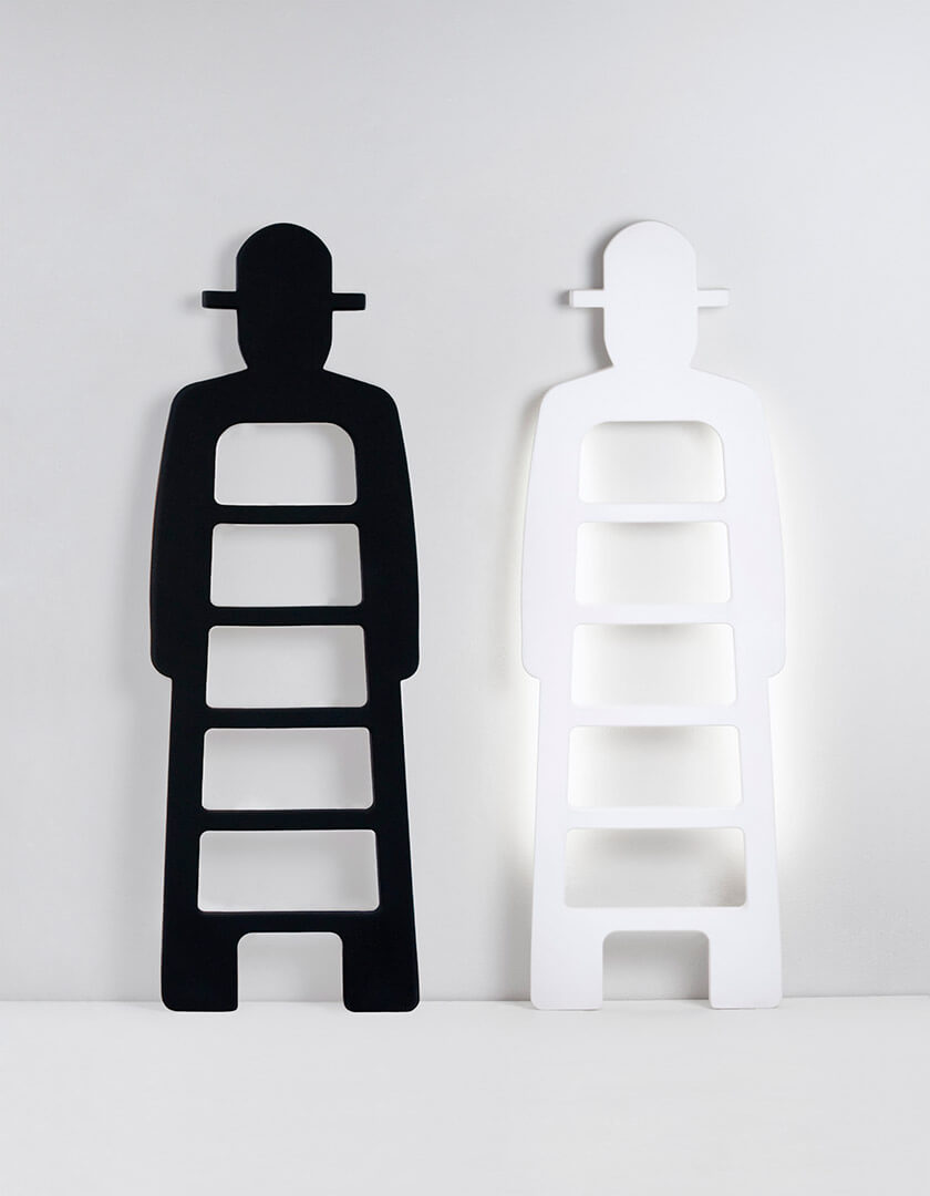 La mente creativa di Giò Colonna Romano ha trasformato un elemento essenziale ma ingombrante come la scala, in una scultura funzionale da esibire nella propria abitazione. Mr. Giò è una scala-scultura ironica e spiritosa, che può essere utilizzata come servomuto, con un design che ricorda un uomo con la bombetta. Disponibile anche nella versione retro-illuminata Mr. Giò Light con tubi neon.