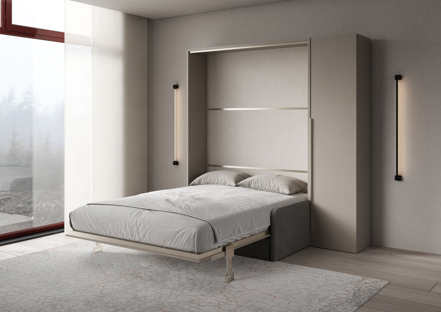 Materiaal Het Versia Sofà 140 cm brede Franse verticale wandbed met geïntegreerde bank herdefinieert het concept van ruimte. Elegantie, functionaliteit en design komen samen in de Versia Sofà, het 140 cm brede Franse verticale wandbed dat de woonkamer transformeert