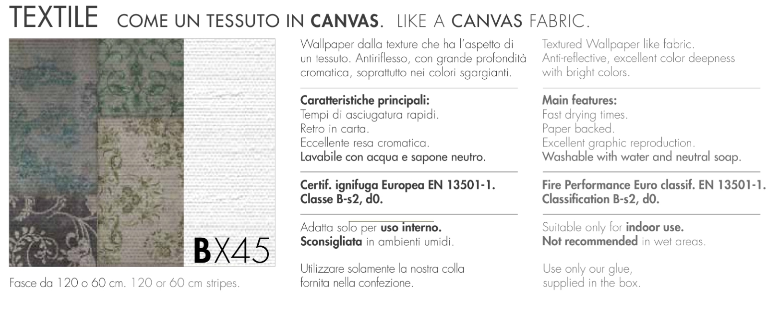 Behang met een gestructureerde, stofachtige uitstraling. Antireflecterend, met een grote kleurdiepte, vooral bij heldere kleuren.