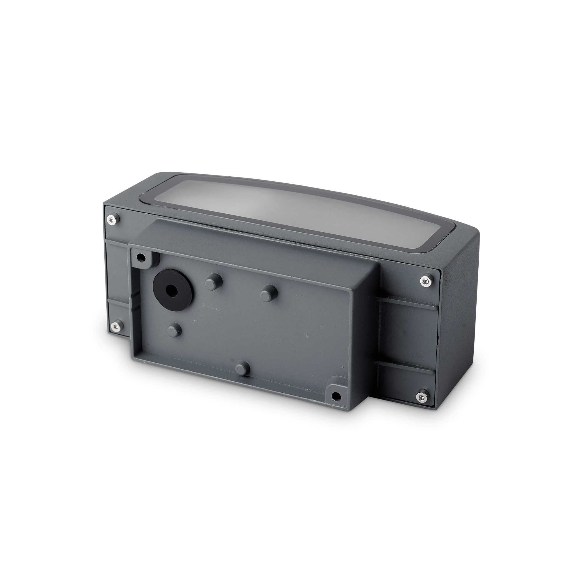 Behuizing van gecoat gegoten aluminium. Dubbele diffuser, boven en onder, van satijngepolijst Pyrex-glas.