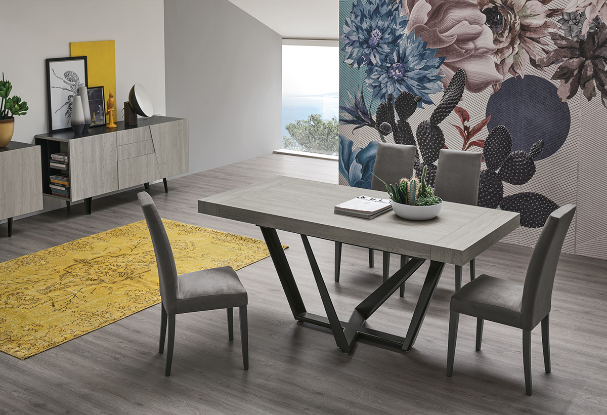 Het tafelblad is gemaakt van gelamineerd hout, met een opstaande rand die de elegantie en robuustheid benadrukt.