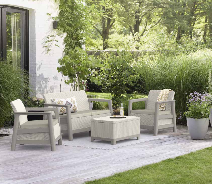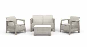 Eenvoudig te monteren. Gemaakt van weerbestendig hars. Textuur met jute-effect. Tweekleurig ontwerp. Tafel met grote opbergruimte.