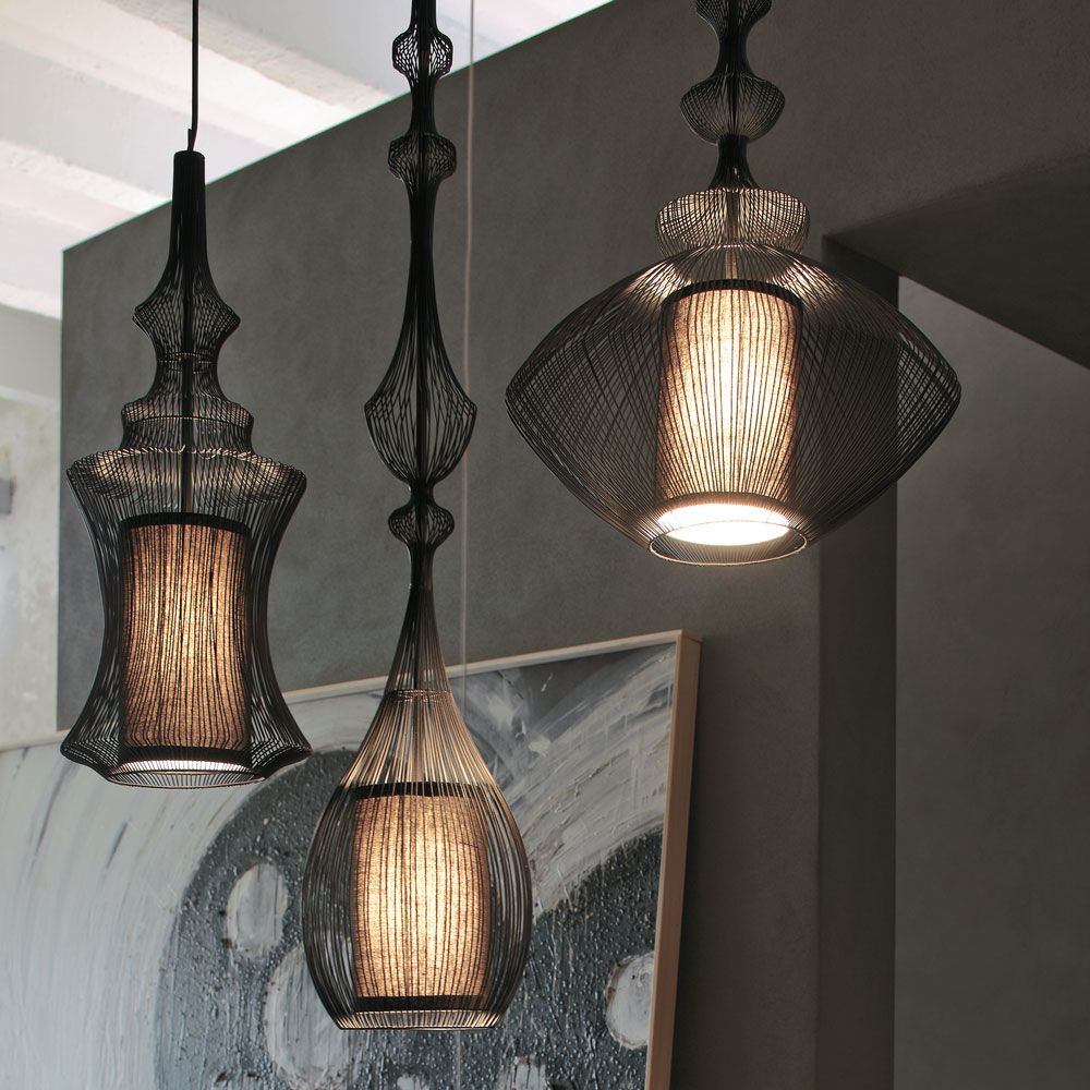 Hanglamp met een zwart gelakte metalen draadconstructie.
