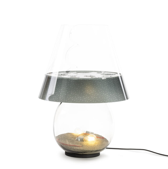 BONBONNE is een designproduct van Italiaanse makelij, met een transparante, gegoten polycarbonaat lampenkap, een glazen behuizing en details van acrylkristal.