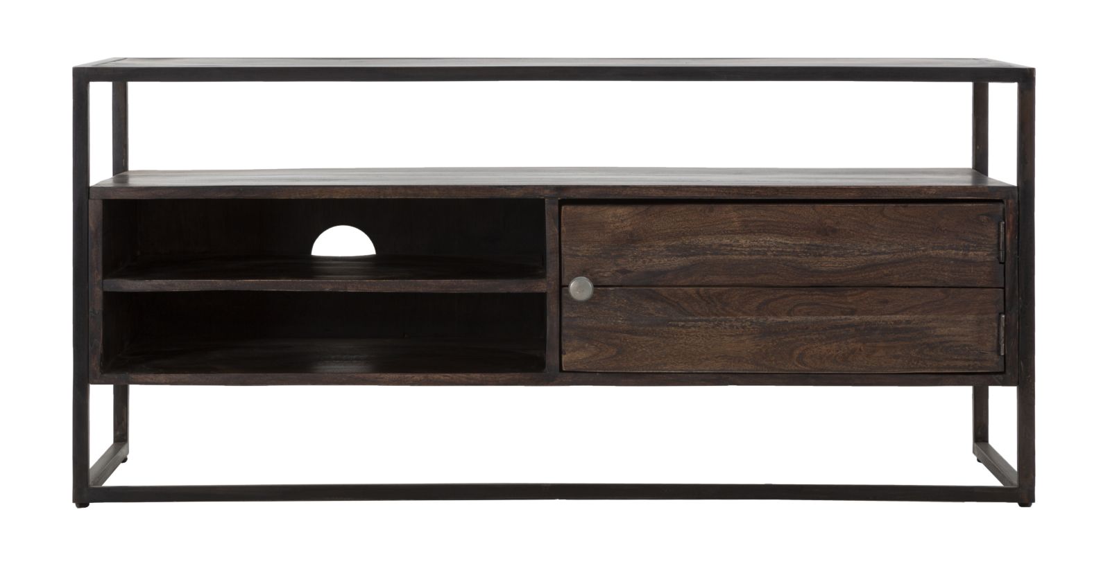 Massief acaciahouten tv-meubel met 3 planken en een deur, omlijst door een zwart metalen frame met strakke, vierkante lijnen die een vleugje moderniteit geven aan dit uiterst elegante en klassieke meubelstuk.