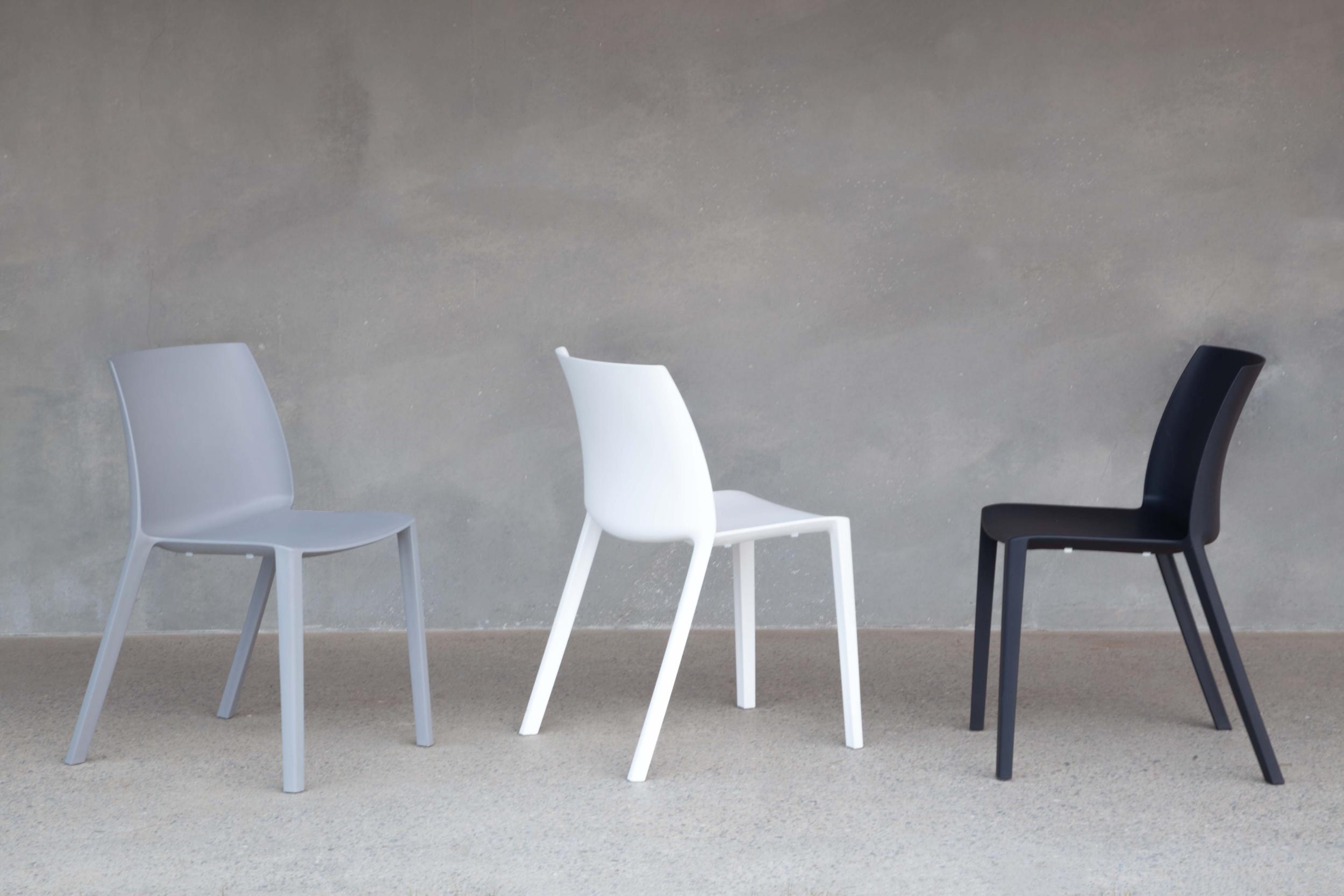 Deze stoel, gemaakt van hoogwaardig polypropyleen, is verkrijgbaar in drie elegante kleuren: wit, zwart en turquoise.