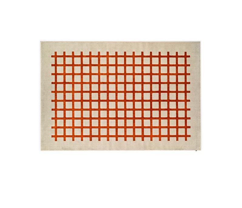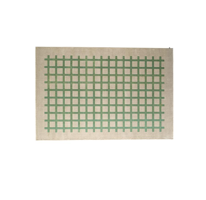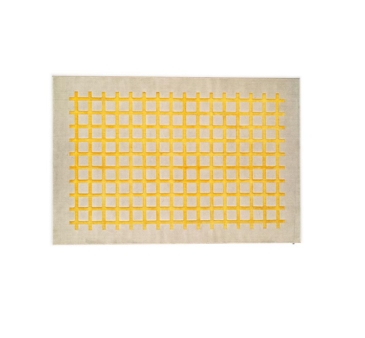 Het patroon bestaat uit een raster van lijnen die een orthogonaal ontwerp vormen: verkrijgbaar in citroen-, tijm- en saffraankleuren, die een vleugje levendigheid toevoegen aan de beige basis van het vloerkleed.