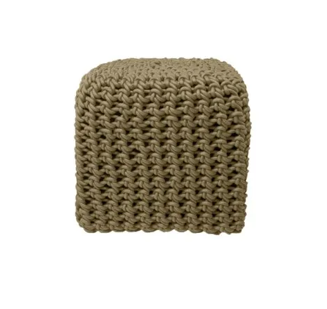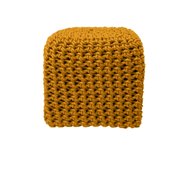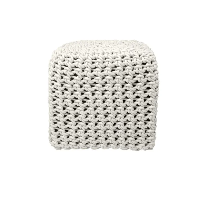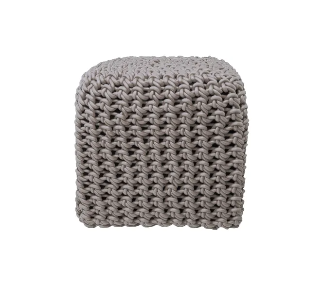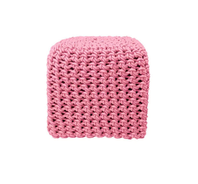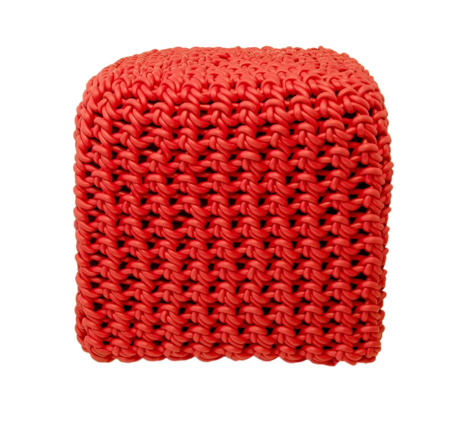 Deze poefs zijn gebreid met geweven rubberdraad.