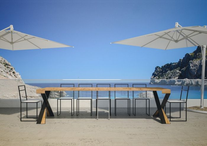 Het heeft een X-vormige ijzeren structuur en een solide en stevig blad.