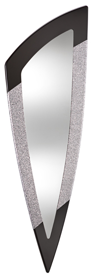 Spiegel met een voorgevormd frame, zwart gelakt en versierd met glitter. Kan horizontaal of verticaal worden opgehangen.