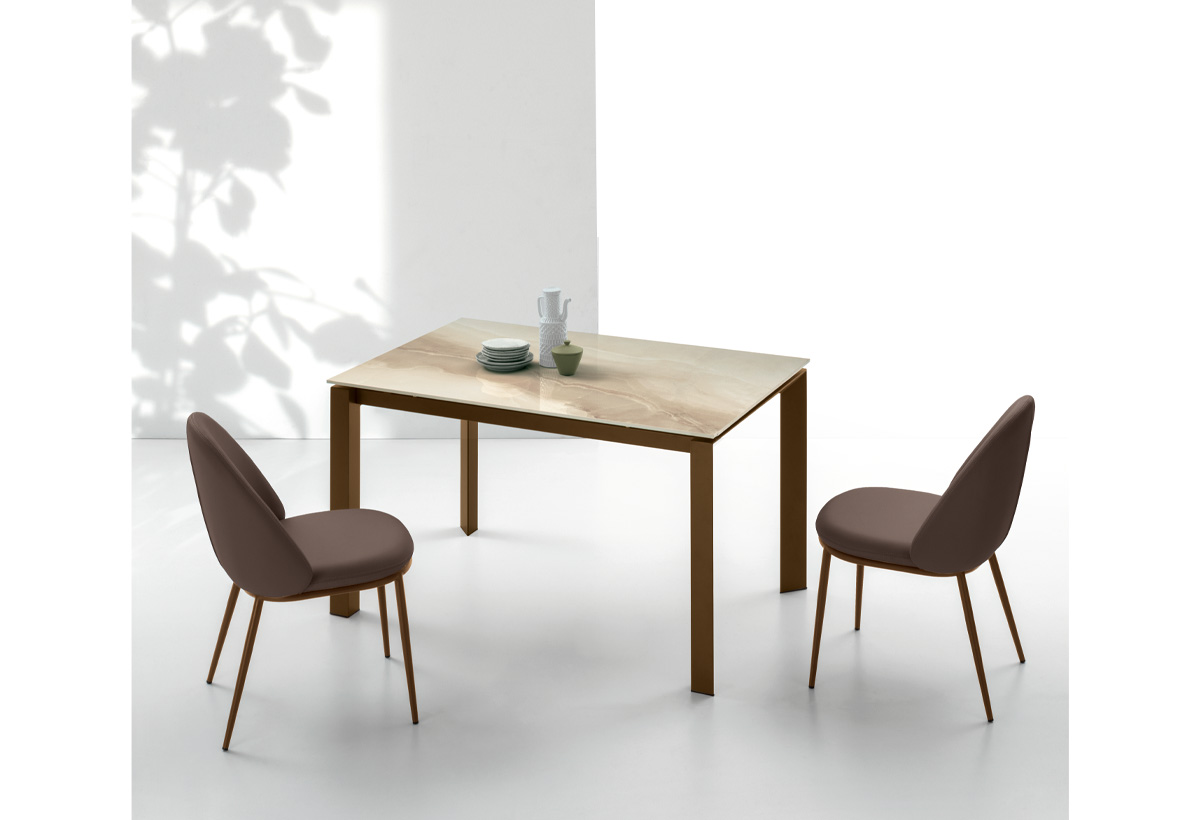 De constructie bestaat uit vier stevige, gelakte metalen poten, terwijl het blad en de zijverlenging zijn uitgevoerd in steengoed met marmerlook, gekenmerkt door een doorlopende ader die elegant over zowel het blad als de verlenging loopt.