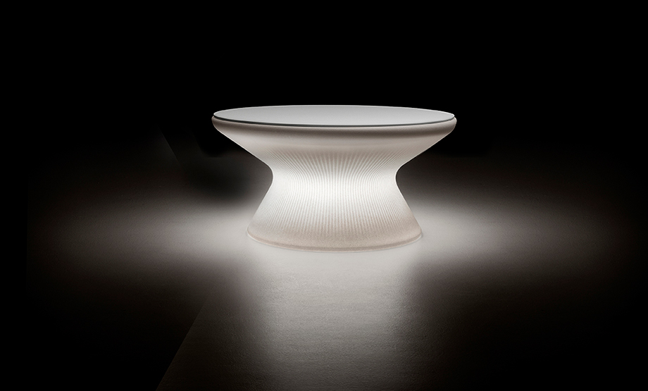Deze lage tafel kan worden gecombineerd met een zwart of wit tafelblad. De zachte lijnen worden geaccentueerd door een origineel gestreept oppervlak met karakteristieke afwerkingen die doen denken aan natuurlijke materialen. In de witte uitvoering kan de tafel worden verlicht met een speciale verlichtingsset, waardoor een betoverende sfeer van diffuus licht voor uw gasten ontstaat.