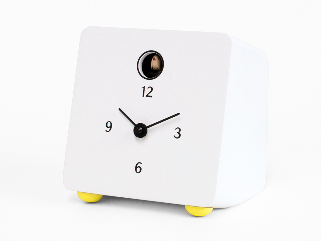 Een tafelmodel koekoeksklok, geïnspireerd op de vorm van een beroemde tv uit de jaren 60, met dezelfde strakke, zachte en afgeronde lijnen. Een object dat al thuis is, aanwezig in de herinneringen van velen, of in de verbeelding van degenen die gefascineerd zijn door de jaren van de eerste stappen op de maan, de geboorte van legendes die vandaag de dag nog steeds voortleven, zoals The Beatles en de Rolling Stones, en zoveel andere gebeurtenissen die onze tijd hebben gevormd. Fido is gemaakt van gelakt hout. Het is een compact object dat op een plank, een meubelstuk of op je bureau geplaatst kan worden als trouwe metgezel tijdens je uren op het werk. Batterijgevoed quartz uurwerk.