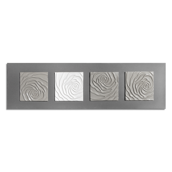 Grijs gelakte canvaslijst met vier handgedecoreerde composiet keramische elementen in ivoorwit en antracietgrijs. 140x40 cm.