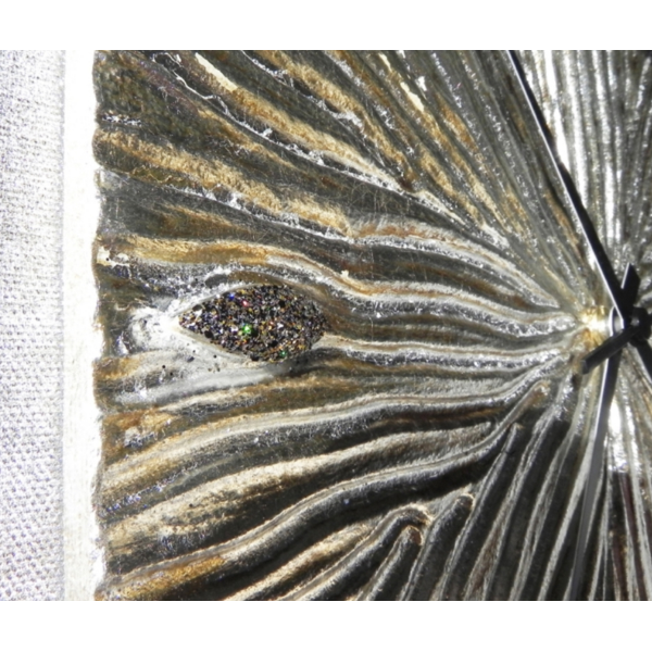 Samengesteld keramisch element, handgedecoreerd met zilverblad, op een canvasstructuur, glanzende afwerking.