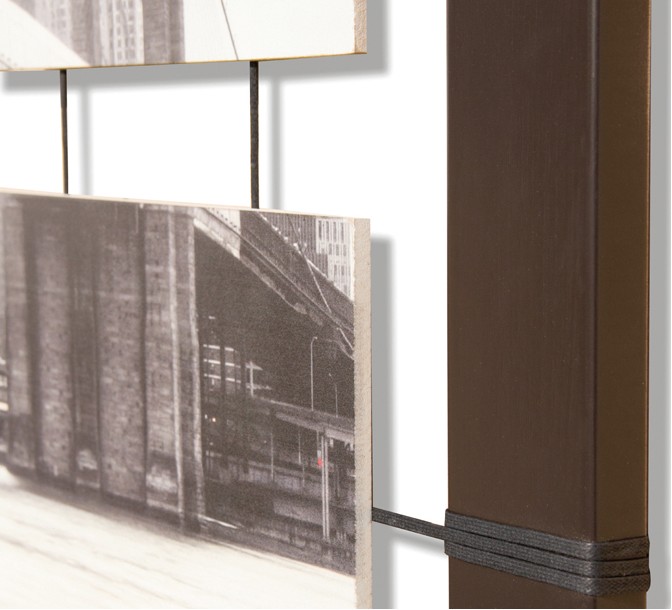 Koffiekleurig gelakte houten lijst met tien handbeschilderde panelen, opgehangen aan touwen.