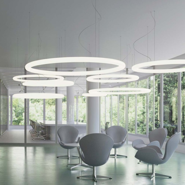 Giotto is een hanglamp van polyethyleen van Slide, ontworpen door Roberto Paoli. De lamp heeft een ring van ledlicht en is verkrijgbaar in drie verschillende diameters: 80, 110 en 140 cm. Dankzij de enkele diffuser verspreidt de lamp het licht gelijkmatig. De eenvoudige vormgeving maakt de lamp elegant en geschikt voor gebruik op zichzelf of in talloze composities, waardoor een dramatische sfeer ontstaat in zowel zakelijke als residentiële interieurs.