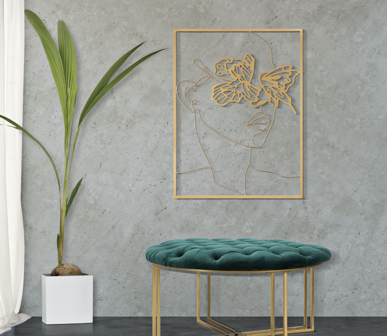 Decoratief 3D-wandpaneel met eenvoudige en essentiële lijnen die een gezicht met vlinders vormen, alles ingesloten in een rechthoekig frame.
