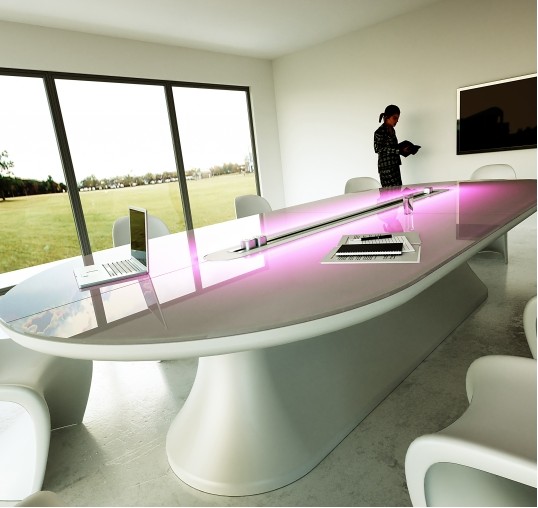 Een design vergadertafel die elegantie en technologie combineert. Met zijn vloeiende lijnen en royale vlakken is de Info Table een waar kunstwerk.