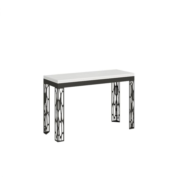 Een inklapbare tafel met een ijzeren frame en geperforeerde poten, in een moderne en originele stijl. Dit model verdubbelt zijn tafelblad in slechts enkele eenvoudige handelingen. Verkrijgbaar met een optioneel verlengstuk dat, eenmaal uitgeklapt, kan worden ingeschoven om de capaciteit verder te vergroten.